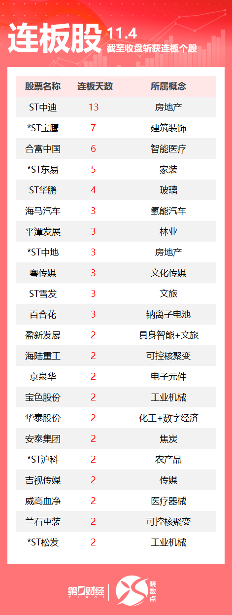11月4日,Wind数据显示 ,A股市场共计68只个股涨停。其中医疗股合富中国收获6连板,可控核聚变板块海陆重工2连板 。一图速览今日连板股>>