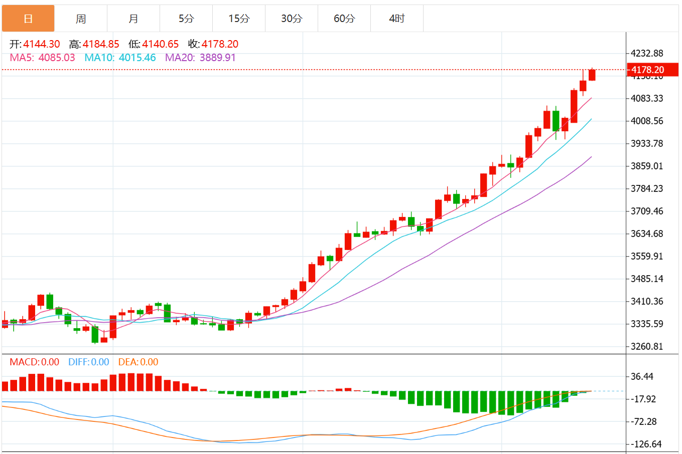 原油技术从趋势分析技术来看,近7周左右的上涨行情始终遵循上升趋势线支撑 。此外 ,金价在突破4,055-4,060美元区域后,周一进一步突破4,100美元大关,巩固了近期看涨前景。